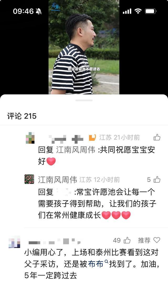 何先生父子的故事被媒体报道后,感动了很多人。9月2日,“常州发布”视频号也报道了这个来自常州队赛场关于生命呐喊的故事,引发了众多网友和常州市民的关注,大家纷纷留言,祝愿小朋友早日康复。