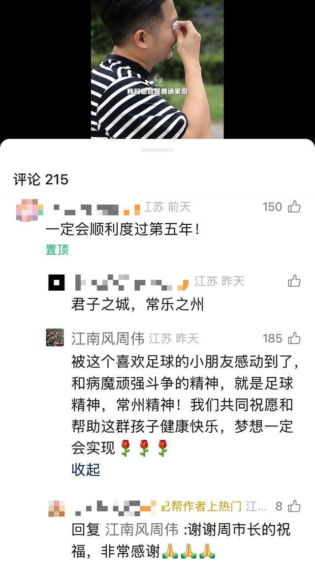 在众多温暖的留言中,署名“江南风周伟”的常州市市长周伟的留言被网友发现。他写道:“被这个喜欢足球的小朋友感动到了,和病魔顽强斗争的精神,就是足球精神,常州精神!我们共同祝愿和帮助这群孩子健康快乐,梦想一定会实现。”同时,他还表示:“常宝许愿池会让每一个需要的孩子得到帮助,让我们的孩子在常州健康成长。”