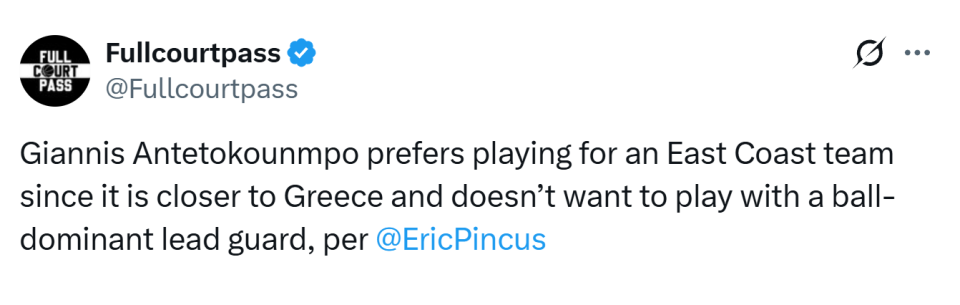 Pincus在文中指出,字母哥更偏爱东海岸,那里距离希腊更近(无论是飞行距离还是时区)。有人称,字母哥怀念和霍勒迪、米德尔顿搭档的日子,那是他2021年夺冠的队友。这并不意味着他想重组当年阵容,只是字母哥不希望和大量持球的核心控卫搭档,他更想成为球队进攻的绝对发动机(霍勒迪和米德尔顿都能无球配合他)。